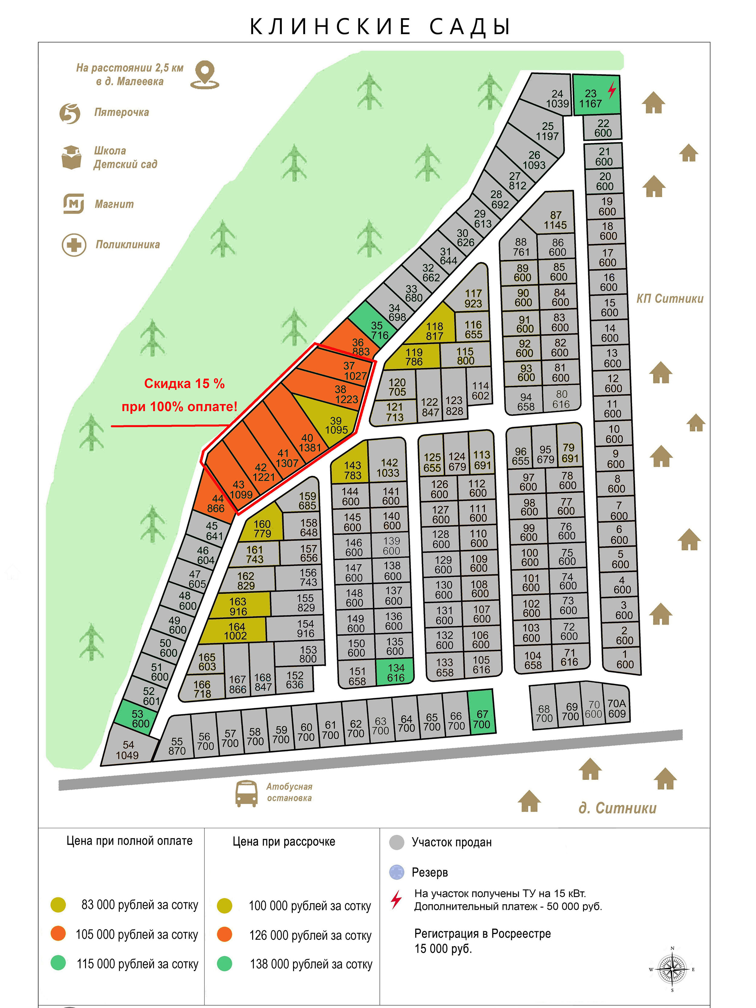 Поселок Клинские сады находится по Ленинградскому шоссе в 78 км от МКАД. Добраться можно на собственном и общественном транспорте - есть возможность доехать на электричке. Транспортная доступность поселка, позволяет выбрать вам любой удобный транспорт